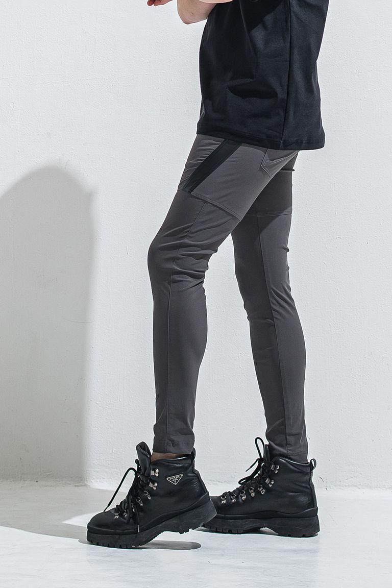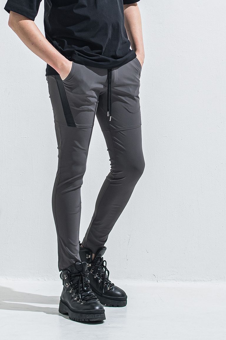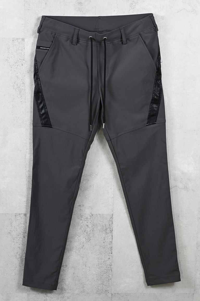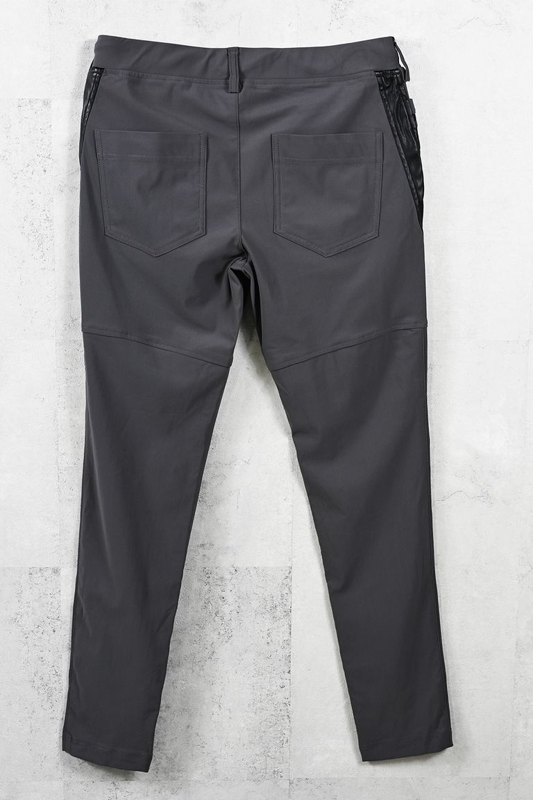 定番のスラックス型のシルエットをベースに、バックからフロントへの立体裁断とサイドラインをエコレザーの切り返しで表現。