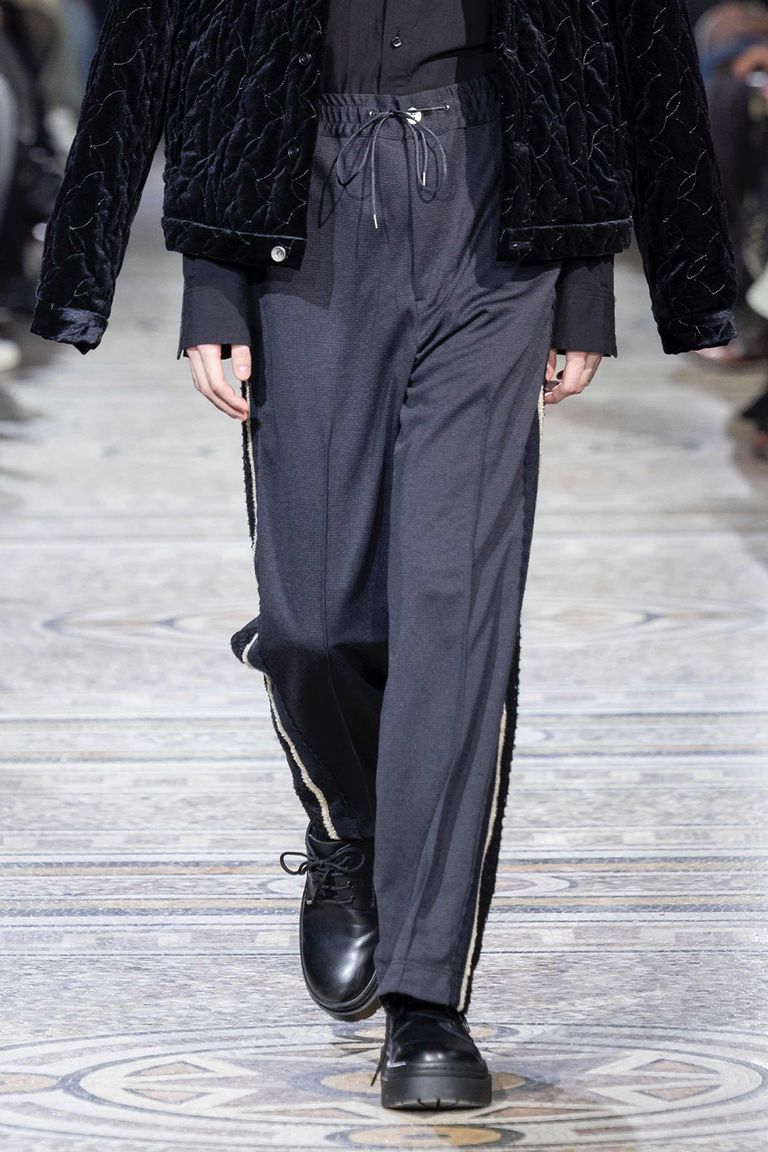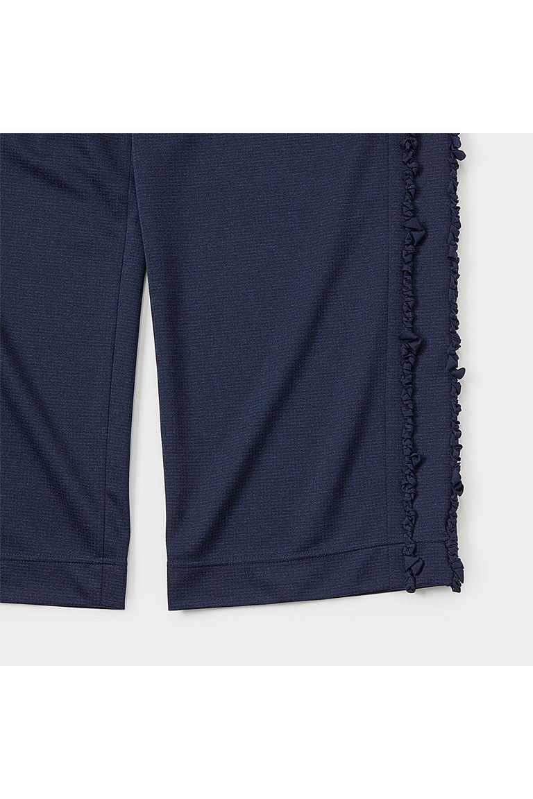 コード刺繍で二重のサイドラインを表現したトラックパンツ。