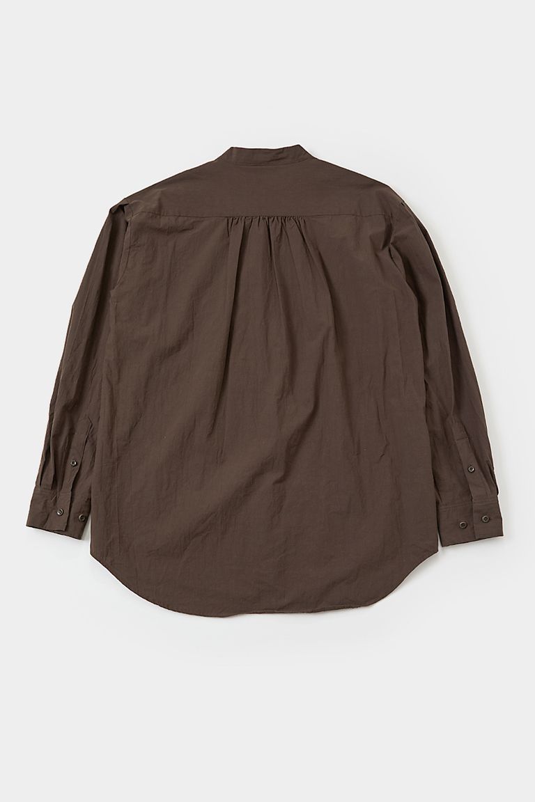 胸元にピンタックを施し、シーチングを間に挟み込むことでプリーツの繊細さと粗野な雰囲気を両立させたスタンドカラーシャツ。