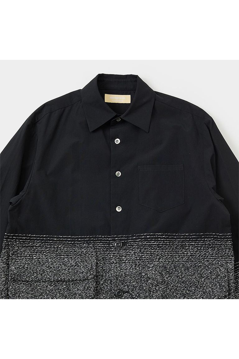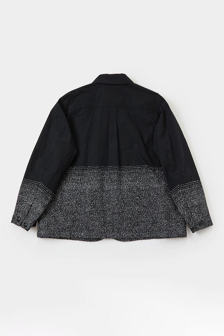 グラデーション部分と柄部分にはモヘア、シルク、ウール、ナイロンの4種混のツイードタッチな太い糸を使用することで、パネルとしてのグランド部分との差を際立たせ、一見すると無地調に見える部分は実際には柄を表現。