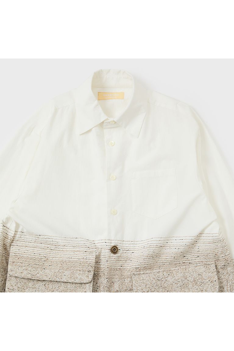 グラデーション部分と柄部分にはモヘア、シルク、ウール、ナイロンの4種混のツイードタッチな太い糸を使用することで、パネルとしてのグランド部分との差を際立たせ、一見すると無地調に見える部分は実際には柄を表現。