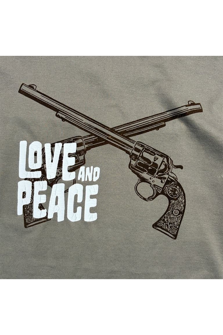 背中にはクロスガンとLOVE and PEACEのメッセージをフロッキーとクラックという異なるプリント手法で表現。