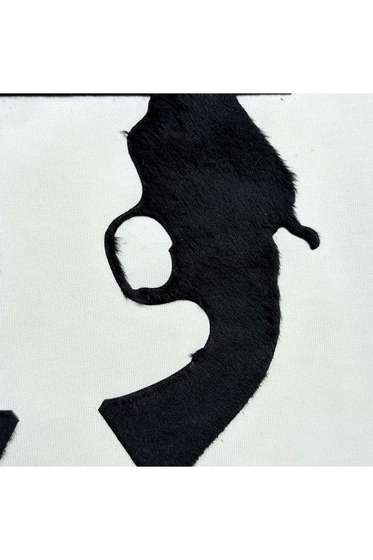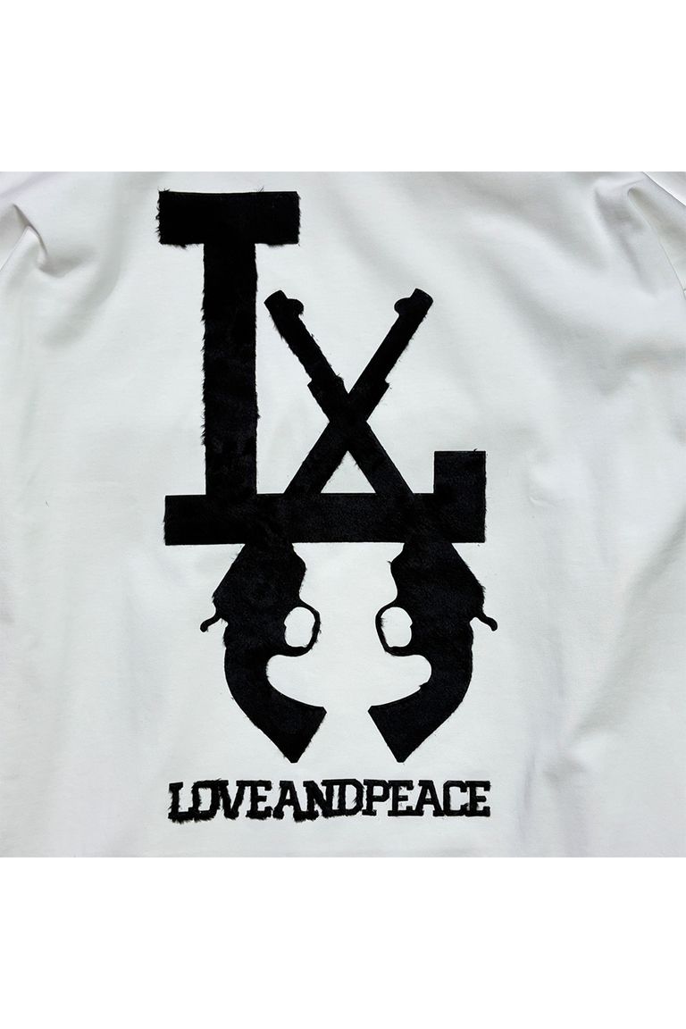 バックにLove and Peaceのメッセージを込めたファーを使った特殊プリント。