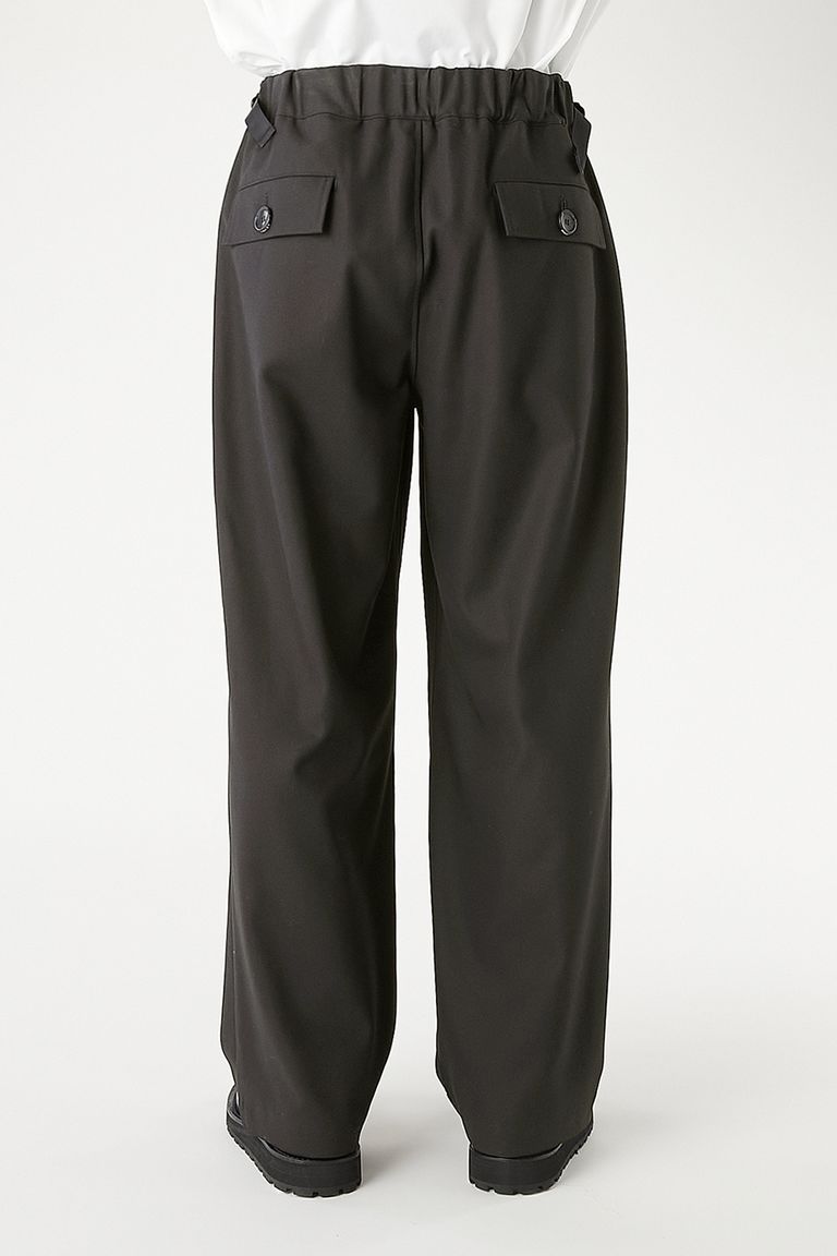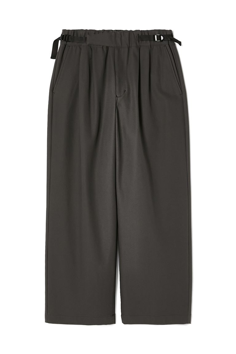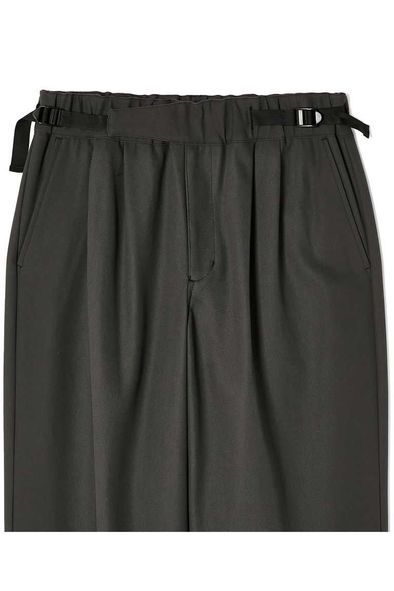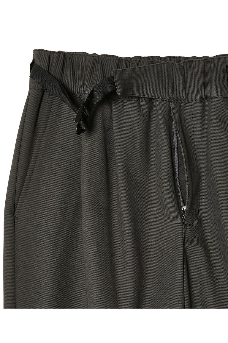 ウエストのナイロンベルトとバックルは黒で統一し、ソリッドな佇まいに。背面のみゴム仕様でドレッシーさと快適な着用感を両立。