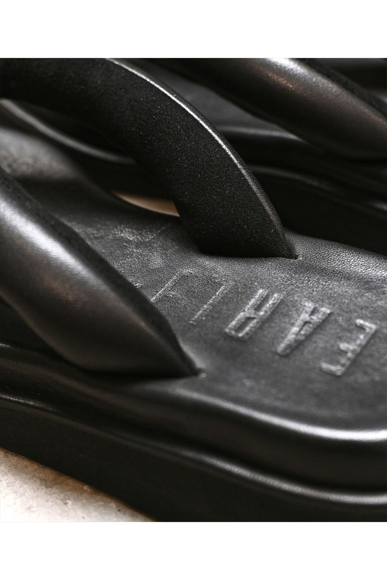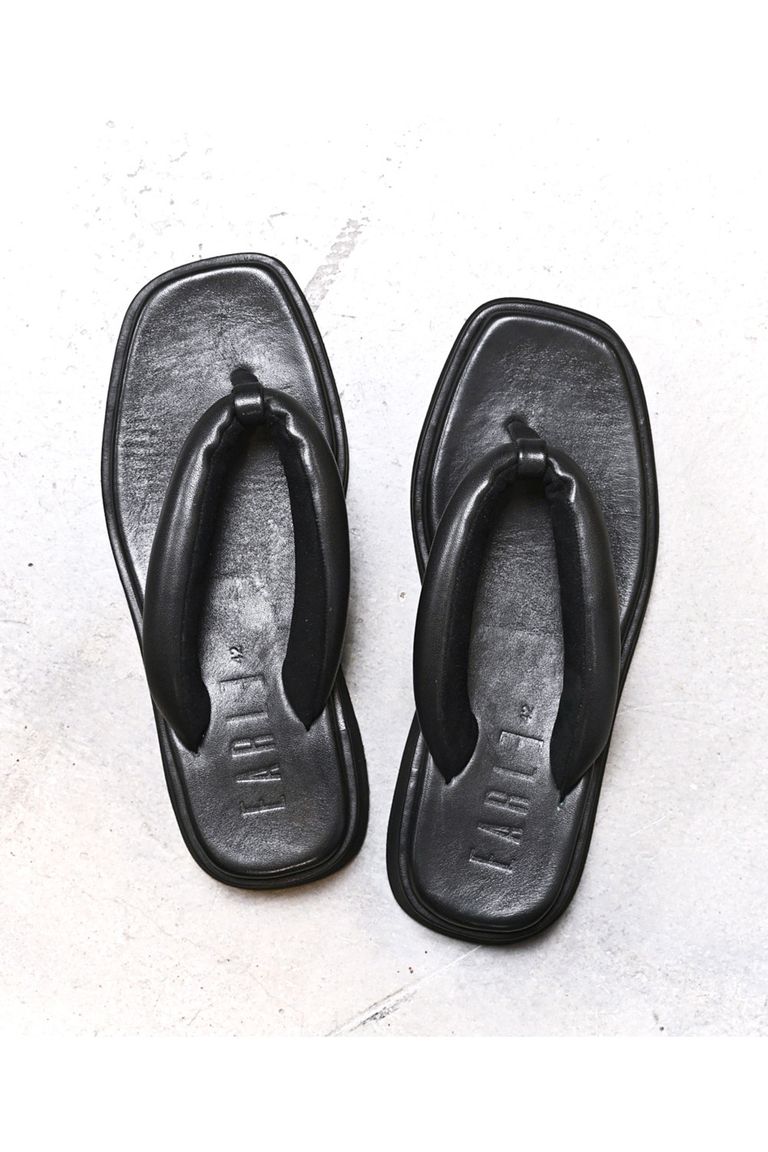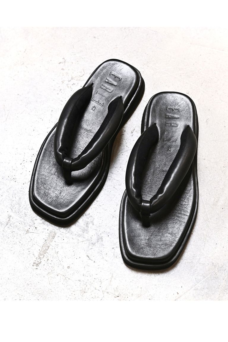 雪駄とトングサンダルのディテールをミックスした、ボリューミーなフルレザートングサンダル。